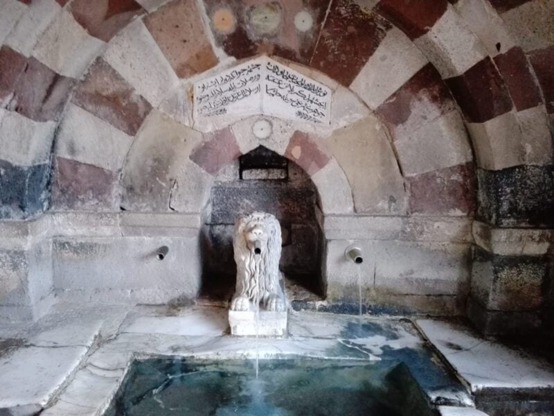 Sağ ve sol tarafta pek çok bölme yer alıyor. Sağ tarafta ilk kemerin olduğu yerde Osmanlıca yazılar ve hemen altında Aslanlı bir çeşme. Anadolu’da Aslan figürlerini özellikle takip etmeye ve incelemeye çalışıyorum. Kibele ile olan bir bağı var mı? Hitit yada Frig döneminden mi bize ulaşmış? Pek çok soruma yanıt bulmaya çalışıyorum.