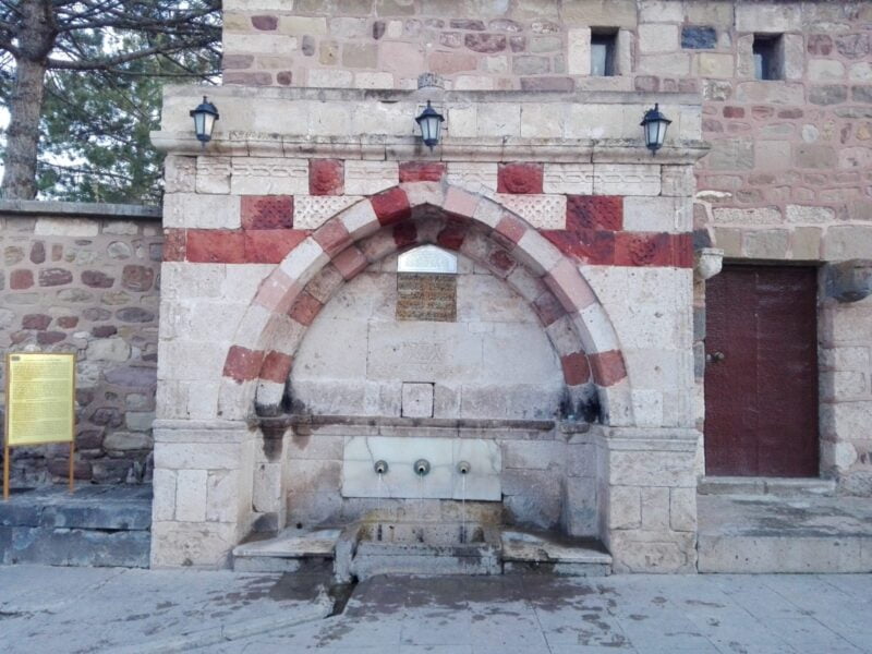 Geniş bir avluya girince sağ tarafta üç noktadan su akan bir çeşme yer alıyor. Çeşmenin yapısını yakından incelerken bir yandan da üç çeşmenin her birinden su içiyoruz. Çeşme ve suyu hakkında ilgi çekici anlatımlar olursa yazıya ilave edeceğiz elbette.