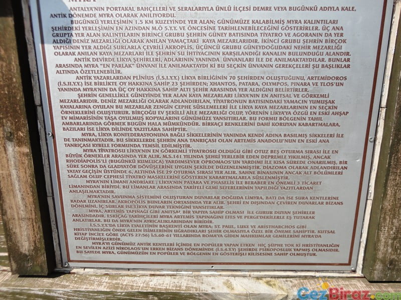 Antalya’nın Demre (Eski adı ile Kale beldesi) ilçesinde yer alan Myra Antik kenti Yüce Ana Tanrıçanın yeri anlamına geliyor. Demre köyünün 1.5 km kuzeyinde yer alır. Likçe Myrrh olarak bilinen kent önceleri dağ yamacı üzerinde iken zaman içerisinde eteklere ve ovaya doğru ilerlemiş. Bugün Myra Antik kentinin tamamını veya daha eski dönemlerini detaylı görmek için biraz tırmanış gerektiriyor. Oy hakkı olarak da en fazla oy hakkı olan kentlerden biri olan Myra Likya’nın 6 büyük kentinden biriydi. Bazı dönemlerde Likya’nın kalbi ve korunaklı olarak kalmayı başarabilmiş nadir kentlerden biri olmuştur.