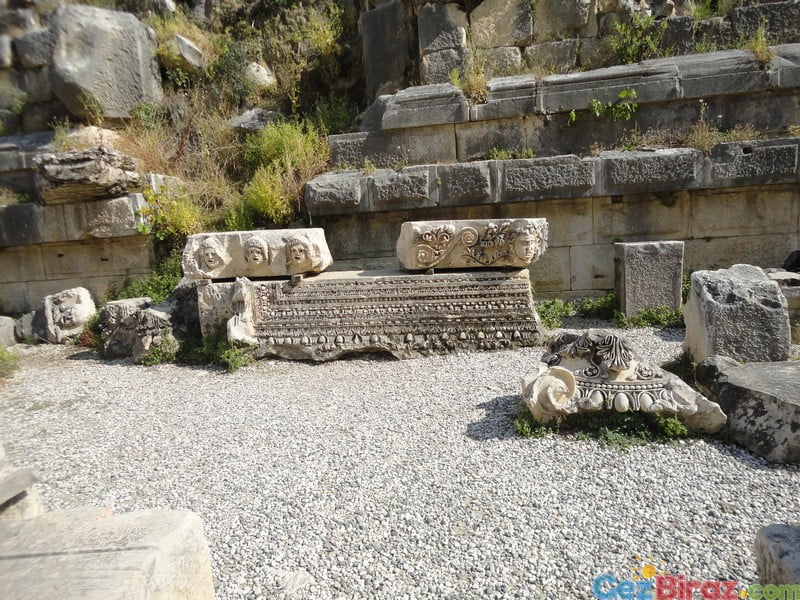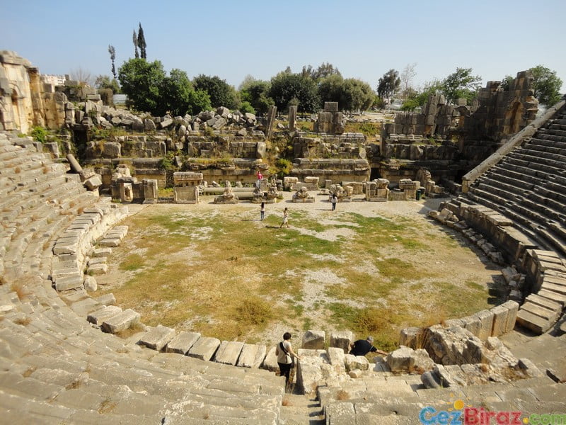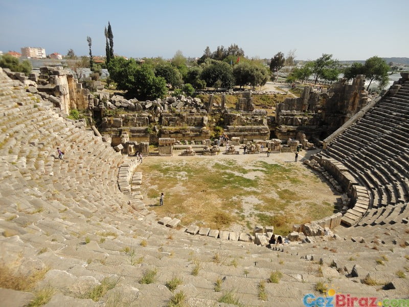 108 metre gibi geniş bir çapa sahip tiyatro kentin büyüklüğü konusunda fikir vermektedir. Tipik Roma Tiyatrosu dikey kaya yüzeyi caveasına göre şekillenmemiş tamamen kendi mimarisi üzerinde yükselmiştir. Alt bölümde 29 üst bölümde ise 6 sıra oturma düzeni mevcuttur. 14 merdiven yolu büyük tiyatronun her noktasına hızlı erişim sağlar. İki konsantrik ve tonozlu galeri ile çevrili olan tiyatroda dışta kalan iki katlıdır. İlginç noktalardan biri de Batı galerisinde iki koridor arasında duvarda Gezici esnaf Gelasius’un yeri şeklinde bir yazı yer alır. Bu seyyar kuru yemiş satıcılarının o dönemde de kalabalıklara hizmet verdiğinin bir örneğidir.